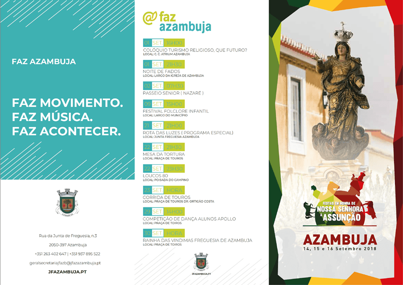 Durante o mês de setembro, a Vila de Azambuja volta a estar animada com variadas atividades promovidas pela respetiva Junta de Freguesia e diversas coletividades locais. Queremos destacar a tradicional festa anual em honra da padroeira da Vila: Nossa Senhora da Assunção, que este ano decorre entre os dias 14 e 16 de setembro.