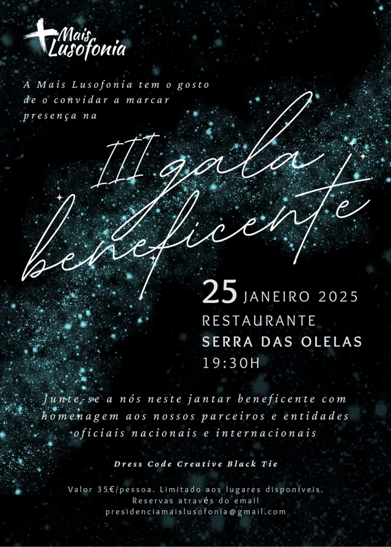 A Associação Mais Lusofonia, com sede em Castelo Branco, Portugal, vai promover a III Gala Beneficente no próximo dia 25 de janeiro de 2025, no Restaurante Quinta das Olelas, localizado na Serra das Olelas, às 19h30.