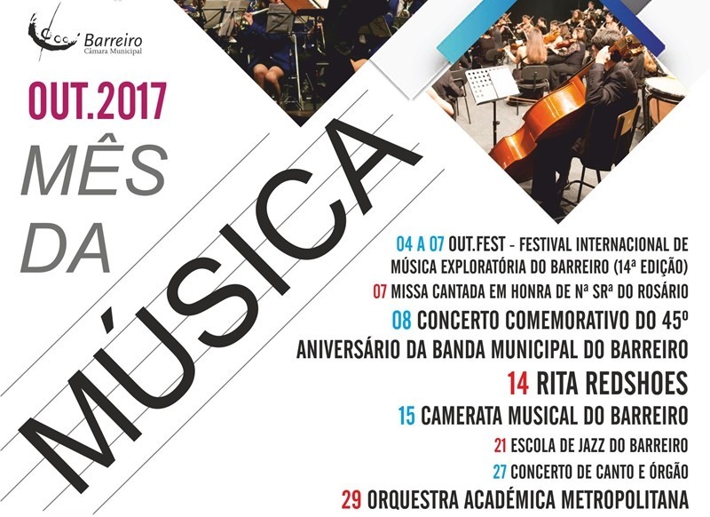 O Out.Fest – Festival Internacional de Música Exploratória do Barreiro, já, de 4 a 7 de outubro, em vários locais do Concelho, dá o mote para o Mês da Música, repleto de iniciativas, inspiradas em vários estilos. No sábado, dia 7, pelas 18h30, na Igreja de Nossa Senhora do Rosário do Barreiro, haverá, no âmbito do Mês da Música, uma “Missa cantada em Honra de Nª Srª do Rosário”. Domingo, dia 8 outubro, pelas 16h00, a Banda Municipal do Barreiro assinalará o seu 45º aniversário com um Concerto comemorativo, no Auditório Municipal Augusto Cabrita.