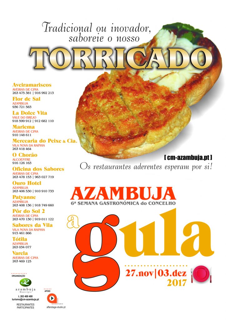 Entre os próximos dias 27 de Novembro e 3 de Dezembro de 2017, vai realizar-se, no concelho de Azambuja, a 6`edição da Semana Gastronómica “A Gula”, uma iniciativa do Município de Azambuja. Esta Semana Gastronómica tem por lema valorizar a gastronomia regional e promover a restauração, os produtos e os vinhos locais. Além da carta habitual com os pratos disponíveis em cada restaurante que aderiu à iniciativa, num total de 14, nestes dias, o visitante é desafiado a degustar o famoso “torricado” acompanhado, em exclusivo, por vinhos produzidos no concelho de Azambuja.